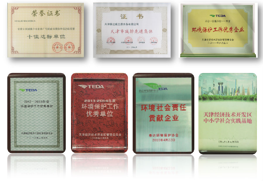公司自成立以來,蒞年榮獲由中國城鎮(zhèn)供水排水協(xié)會、泰達環(huán)境保護協(xié)會、開發(fā)區(qū)管委會、泰達控股有限公司等機構(gòu)頒發(fā)的各類先進榮譽共20余項,得到了天津市和開發(fā)區(qū)環(huán)保局、開發(fā)區(qū)管委會及合作股東的認可。
